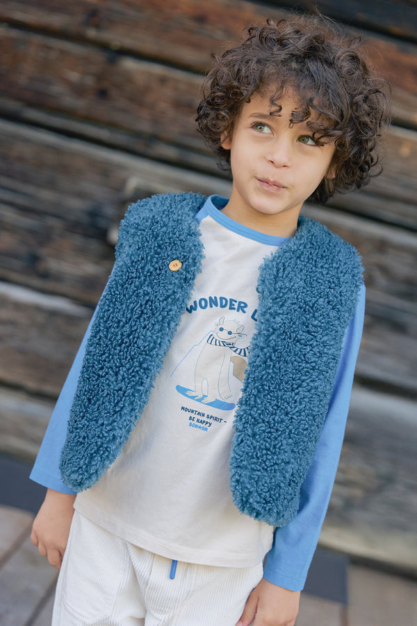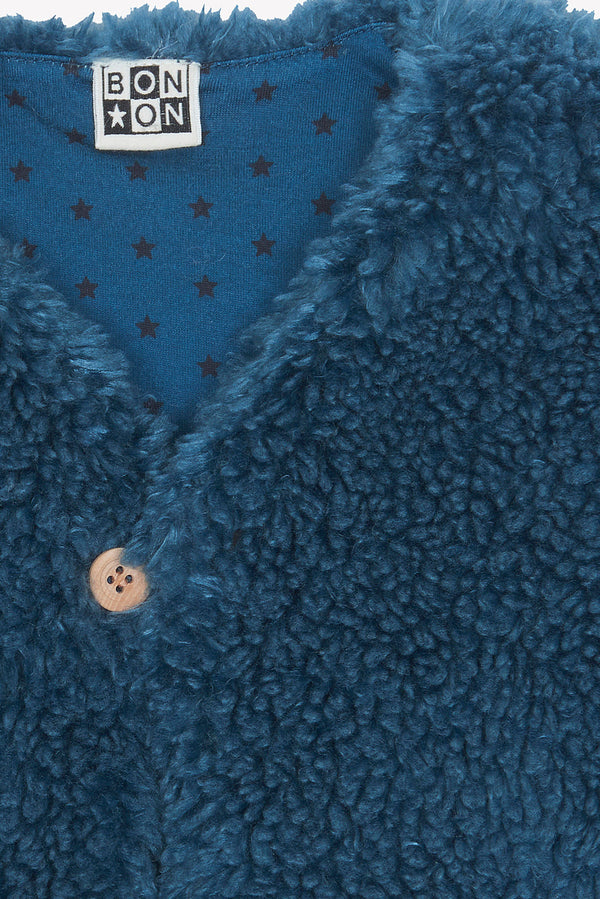 Weste in petrol blau Fake Fur Holzknopf Innenfutter aus Baumwolle mit Sternen-Print 100% Polyester und 100% Baumwolle